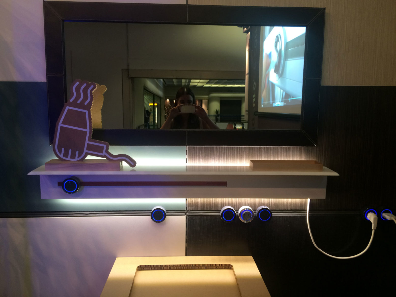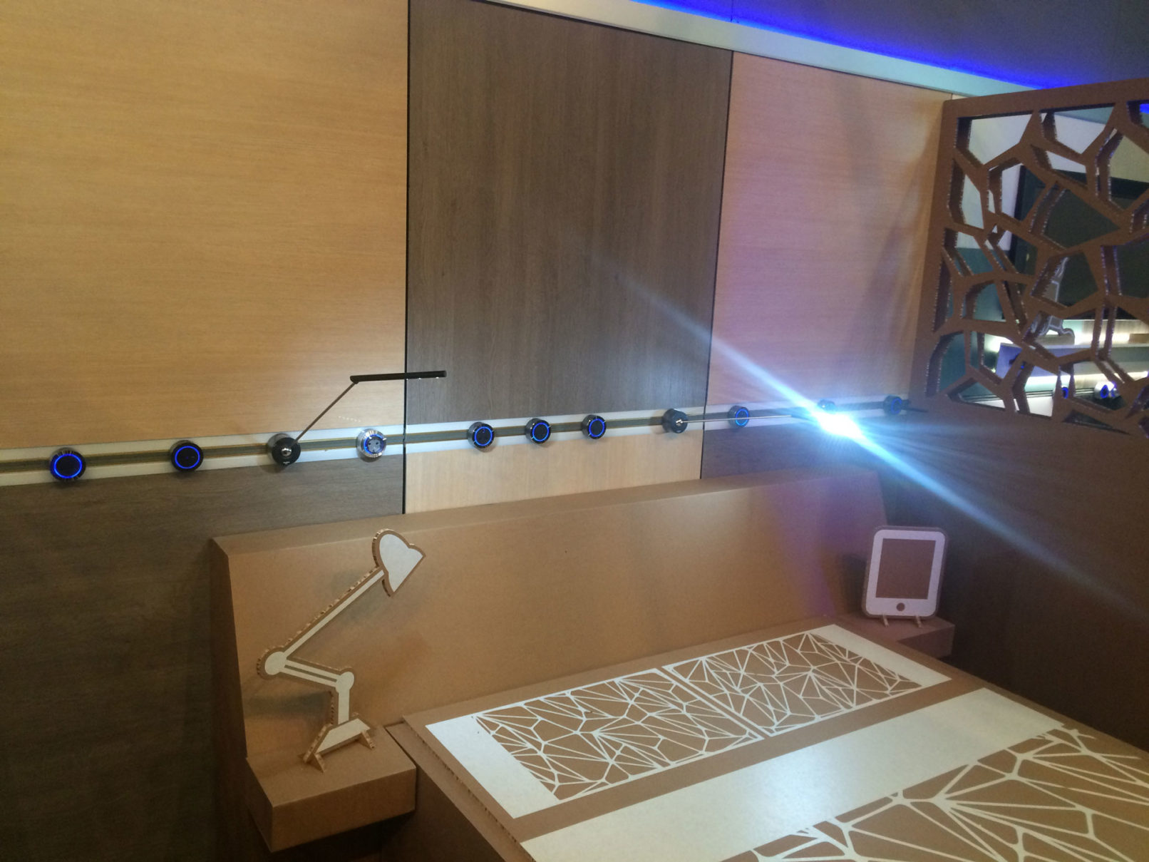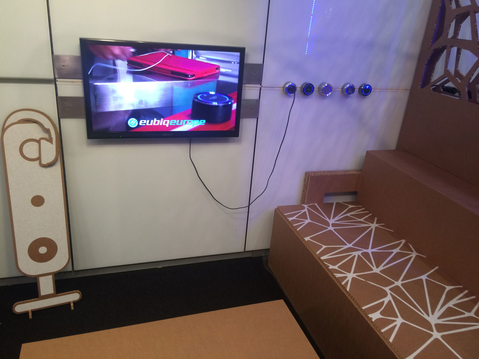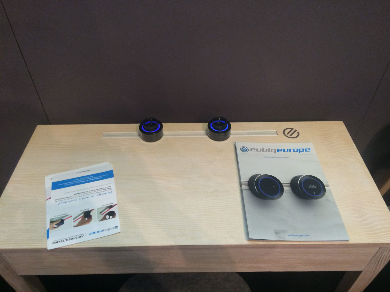 Per la fiera internazionale Abitare il Tempo 2015 è stato realizzato uno stand espositivo il quale simula un ambiente domestico interamente creato con mobili fittizi in cartone. Il profilo elettrificato Eubiq è stato integrato in ogni ambiente, in particolare nelle pareti di vetro è stato inserito il minimale Inside in maniera tale da dimostrare la dinamicità di questo profilo che può essere installato in qualsiasi materiale. Vicino alle scrivanie sono state collocate delle torrette elettrificate mente nell’ambiente bagno è stata applicata Corall, la mensola elettrificata totalmente Made in Italy.