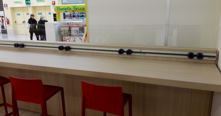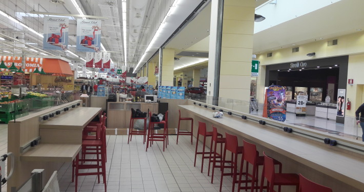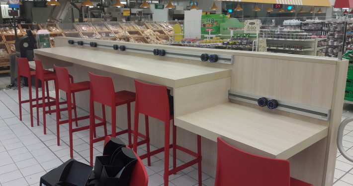 Le immagini di seguito mostrano l’elettrificazione della zona ristoro situata nel centro commerciale. Il profilo scelto è SC2 totalmente elettrificato nella quale sono stati inseriti gli adattatori Premium (Italiano e Caricatore USB) muniti di blocco di sicurezza. Come si può notare dalle immagini, con questa integrazione del sistema Eubiq in una zona ristoro, le persone trovano una luogo dove poter mangiare, rilassarsi e nello stesso tempo rispondere ad un email, o mettere in carica lo smartphone/ipad.