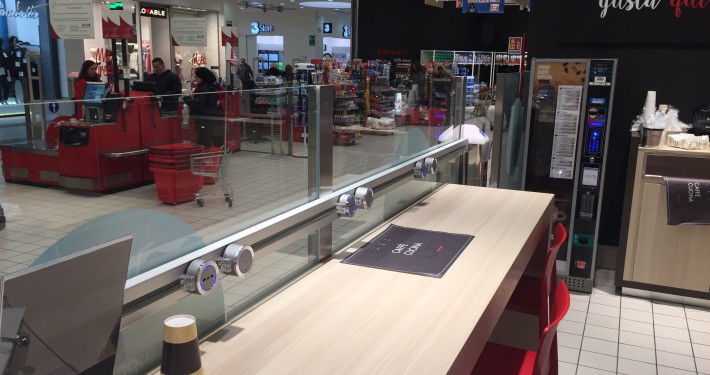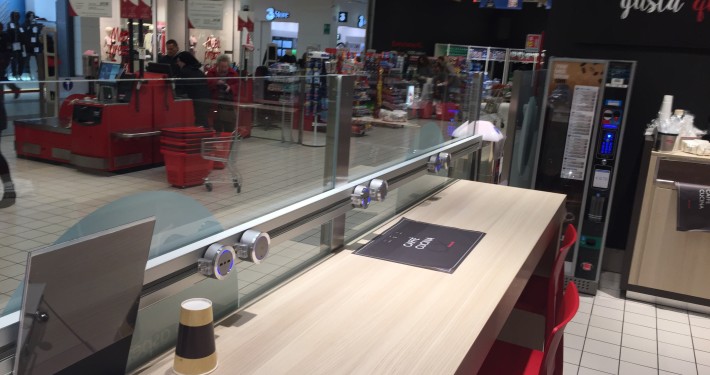 Le immagini di seguito mostrano l’elettrificazione della zona ristoro situata nel centro commerciale. Il profilo scelto è SC2 totalmente elettrificato nella quale sono stati inseriti gli adattatori Premium (Italiano e Caricatore USB) muniti di blocco di sicurezza. Come si può notare dalle immagini, con questa integrazione del sistema Eubiq in una zona ristoro, le persone trovano una luogo dove poter mangiare, rilassarsi e nello stesso tempo rispondere ad un email, o mettere in carica lo smartphone/ipad.