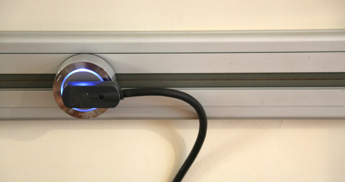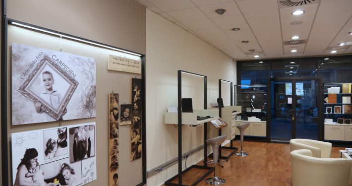 Poligoni Design ha integrato il sistema Eubiq nella scelta dell’arredamento per lo studio fotografico Carpediem, in particolare ha applicato il profilo a parete SH sotto le postazioni pc e dietro ad una scaffalatura espositiva per poter rendere più elegante e ordinata l’accoglienza clienti. L’altro profilo scelto è RH, il prodotto ad incasso, inserito in un tavolo spesso utilizzato dai dipendenti per sviluppare progetti e idee.
